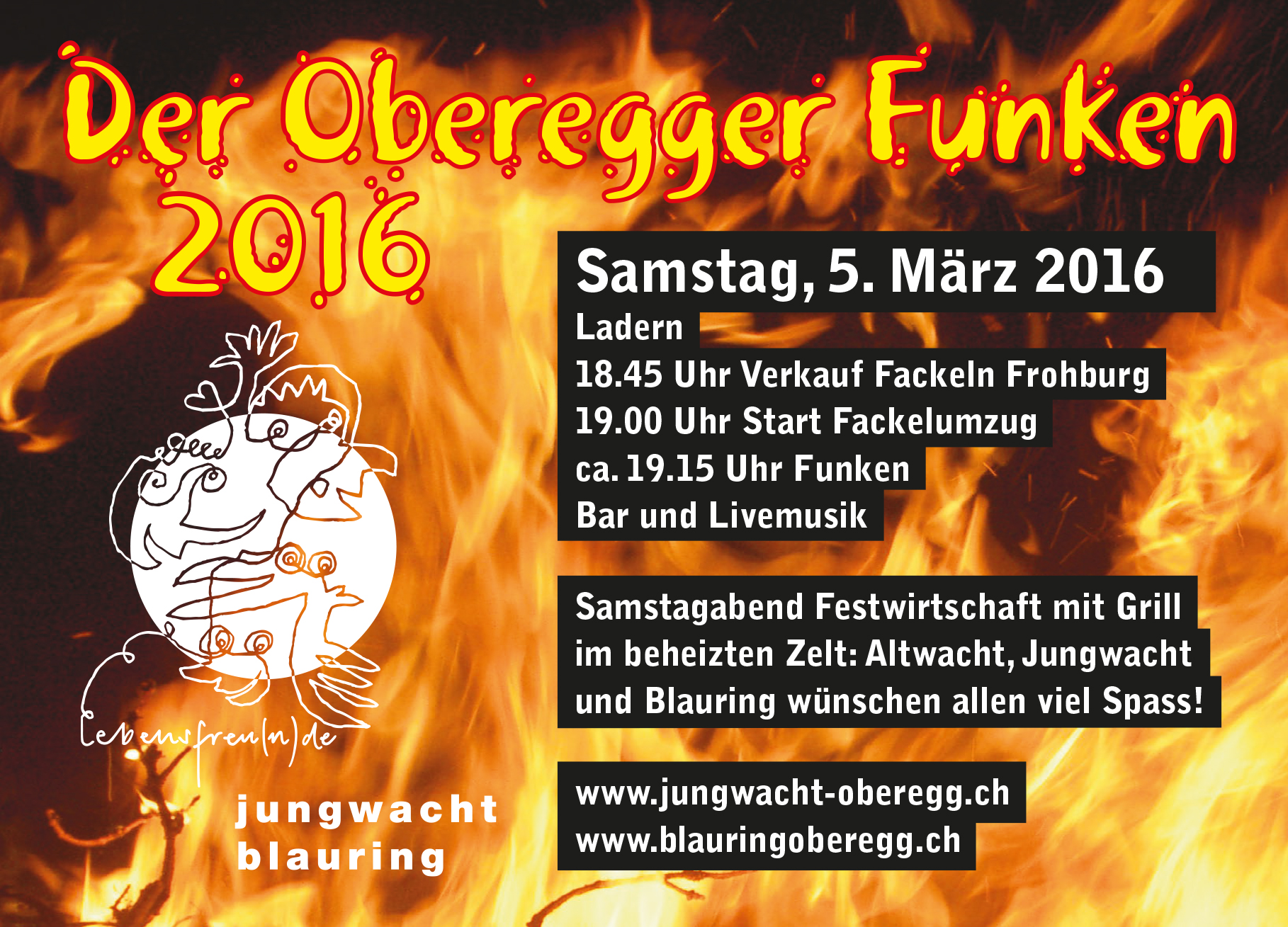 Kinder und Jugendliche sind während des Fackelumzugs und beim Funkenplatz nicht beaufsichtigt. Die Veranstalter übernehmen keine Haftung. (Kleinkinder nur in Begleitung von Erwachsenen).